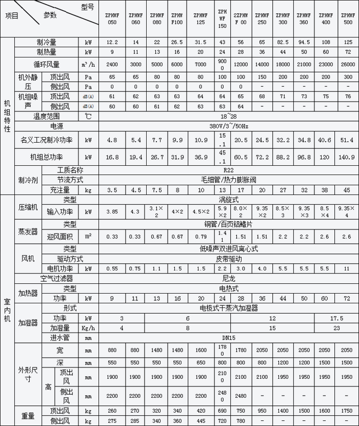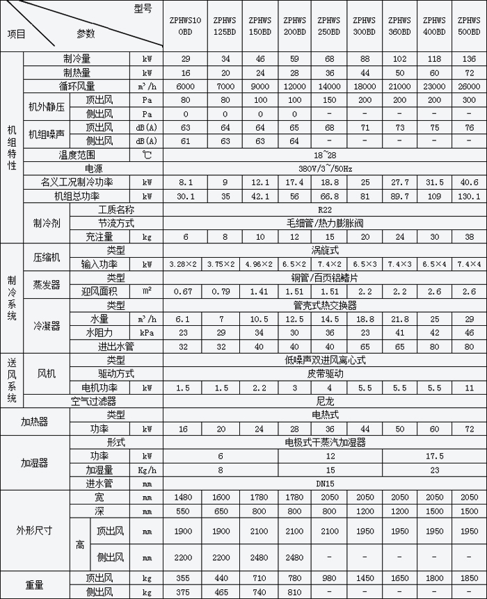 備注: 1.運行工況:回風溫度為23℃/17℃;冷卻水進水30℃,出水35℃; 2.機組正常運行范圍:制冷時:室內進風溫度18℃~28℃,進水溫度20℃~34℃; 制熱時:室內最高進風溫度27℃。 風冷恒溫恒濕空調機性能參數表  備注: 1.運行工況:回風溫度為23℃/17℃;冷卻水進水30℃,出水35℃; 2.機組正常運行范圍:制冷時:室內進風溫度18℃~28℃,進水溫度20℃~34℃; 制熱時:室內最高進風溫度27℃。